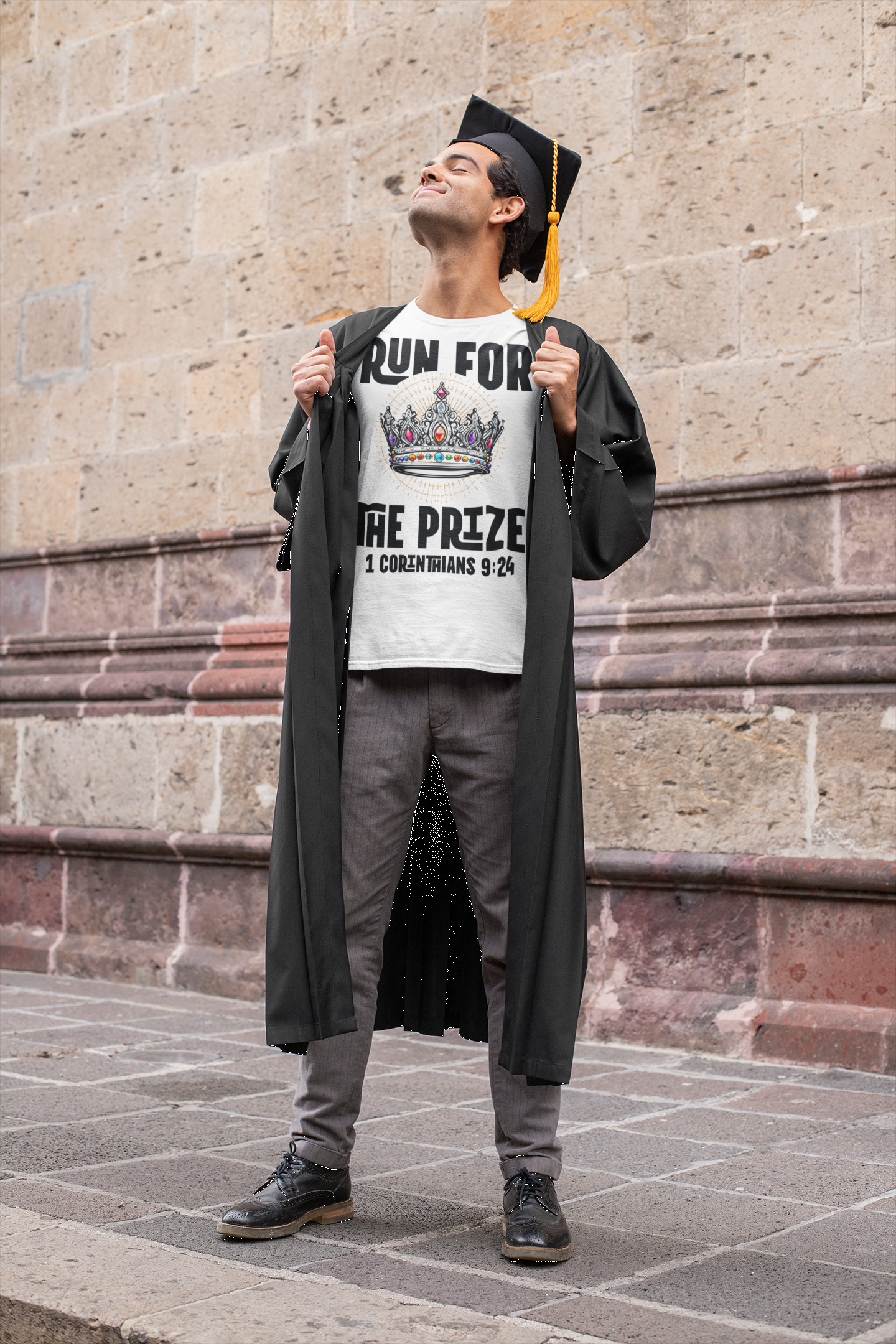 **Run For The Prize T-Shirt** Is a unisex tee-shirt features the words 'Run for the crown' design, giving off a Christian sporty and competitive vibe. It is perfect for those who enjoy active wear and expressing their love of god. Ideal for sports enthusiasts, runners, and those who love competition.